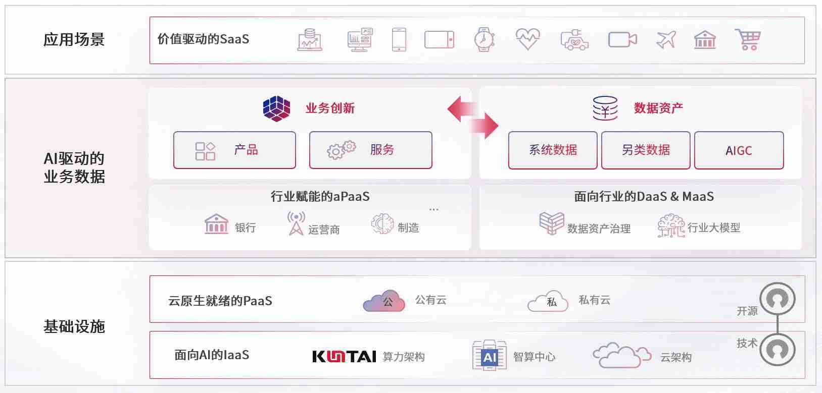 数字时代,,,,围绕企业数字化转型的关键要素,,,,NG娱乐数码开创性的提出数云融合战略和技术体系框架,,,着力在云原生、、数字原生、、、、AI原生和信创产业上架构产品和服务能力,,,为处在不同数字化转型阶段的快消零售、、、汽车、、、、金融、、、、医疗、、政企、、、教育、、运营商等行业客户提供泛在的敏捷IT能力和融合的数据驱动能力,,,构建跨界融合创新的数字业务场景和新业务模式,,,,助力企业级客户建立面向未来的核心能力和竞争优势,,,全面推动社会的数字化、、智能化转型升级。。
