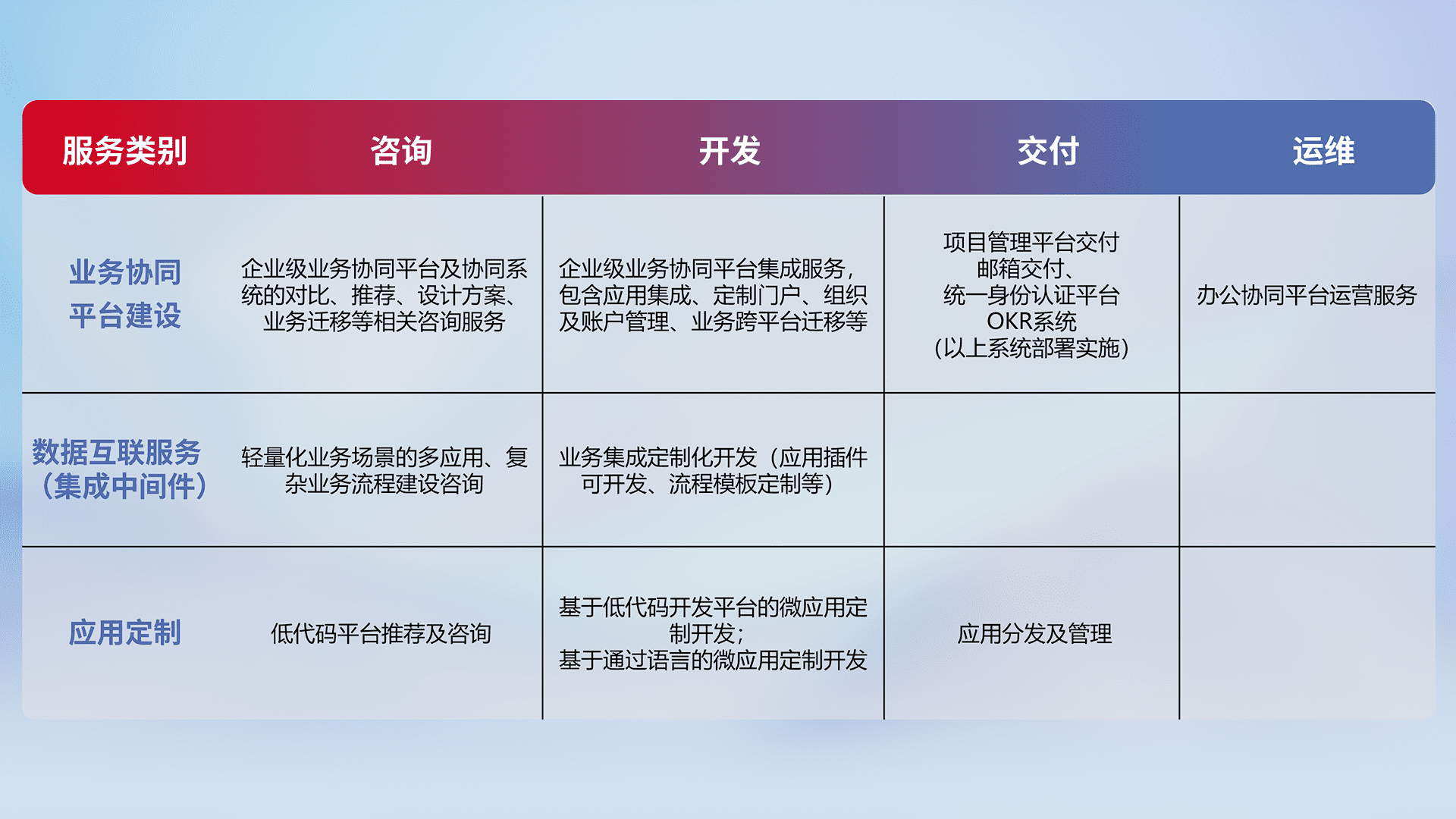 针对钉钉、、、企微、、、IDaas等平台级产品提供产品的规划、、方案、、、交付、、、定制化开发等服务,,,实现如统一协同办公、、、、智能客户服务、、、、混合会议管理、、智能数据查询、、、等业务场景,,,实现数字化转型。。。
